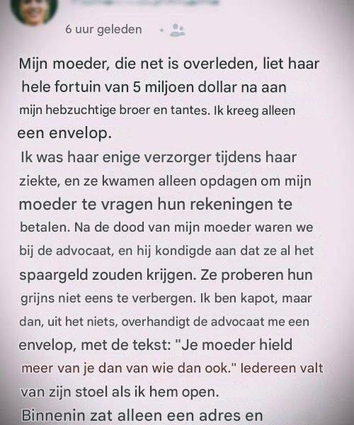 Maar toen de advocaat het testament voorlas, luister ik vol ongeloof.